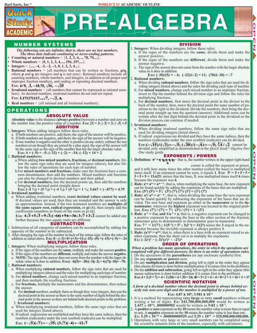 Boost grades and the understanding of early algebra concepts that can make or break the long-term study of algebra through middle and high school and on to college. Textbooks and classes cover so much over months at a time that the details at different stages of learning are passed up with expectations of students remembering all the details of every stage of learning. This 6 page laminated reference guide is expertly authored and designed to offer a quick detailed overview of all stages of early algebra learning. So all concepts can be seen at a glance before reading texts or listening to instructors, during study and homework, or further into the class for refreshing before quizzes and exams. It can help the math-rusty parent homework coach as well to get the algebra gears turning again so you can be the homework hero. Topics covered include: Number Systems; Operations; Algebra; Concepts; Translating Words into Algebraic Statements; Algebraic Equations; Algebraic Inequalities; Coordinate; Plane Geometry; Ratio; Portion; Percent.